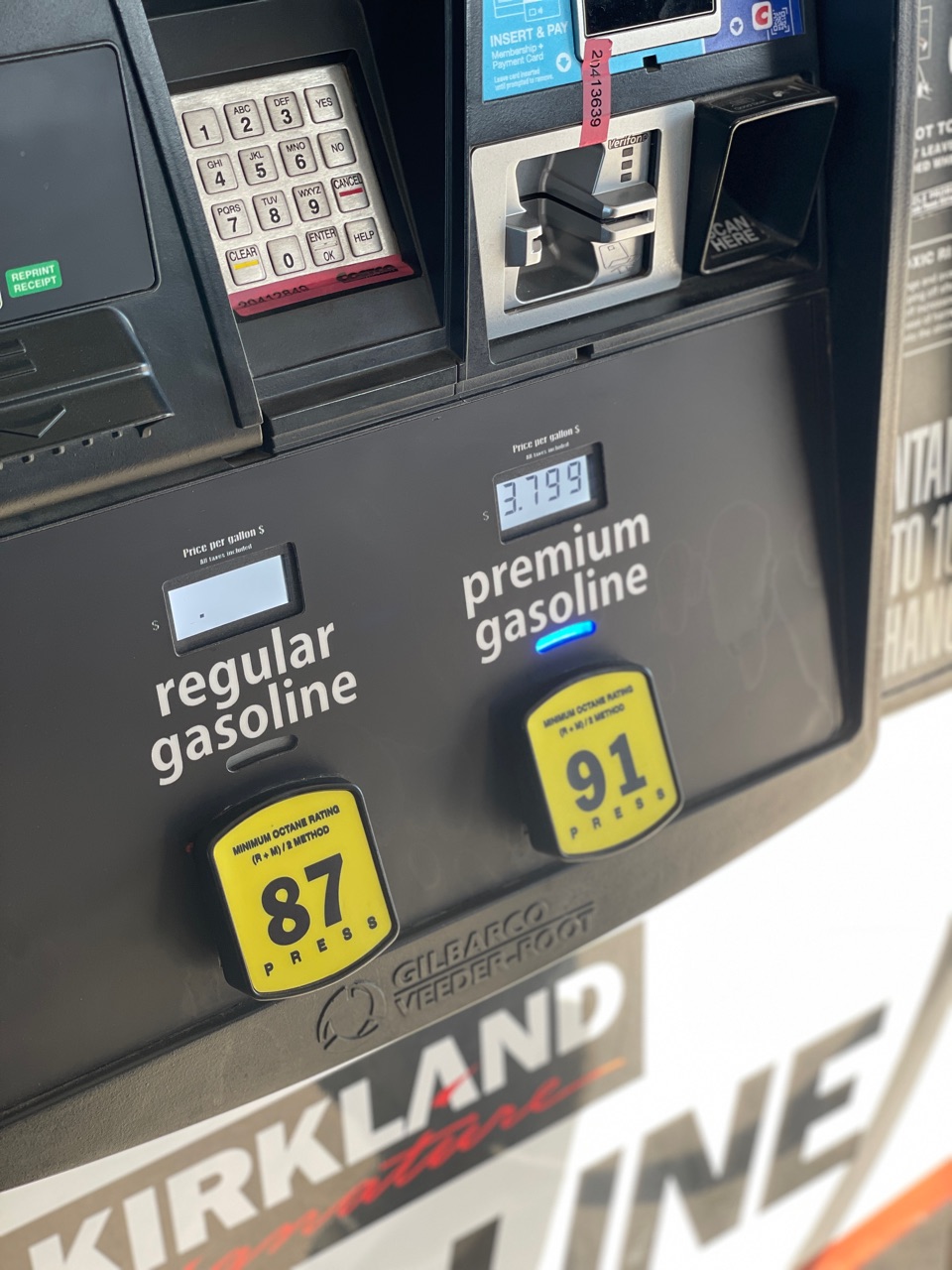 プレミアムは$3.799(/ガロン=約3.8リットル)、レギュラーは確か$3.299(/ガロン=約3.8リットル)だったかな?