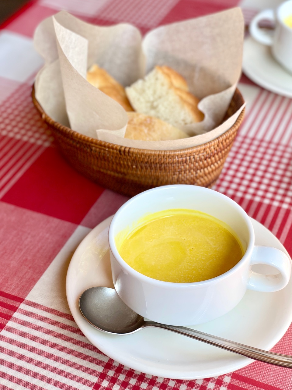 最初に、パンプキンスープ+フォカッチャ↓