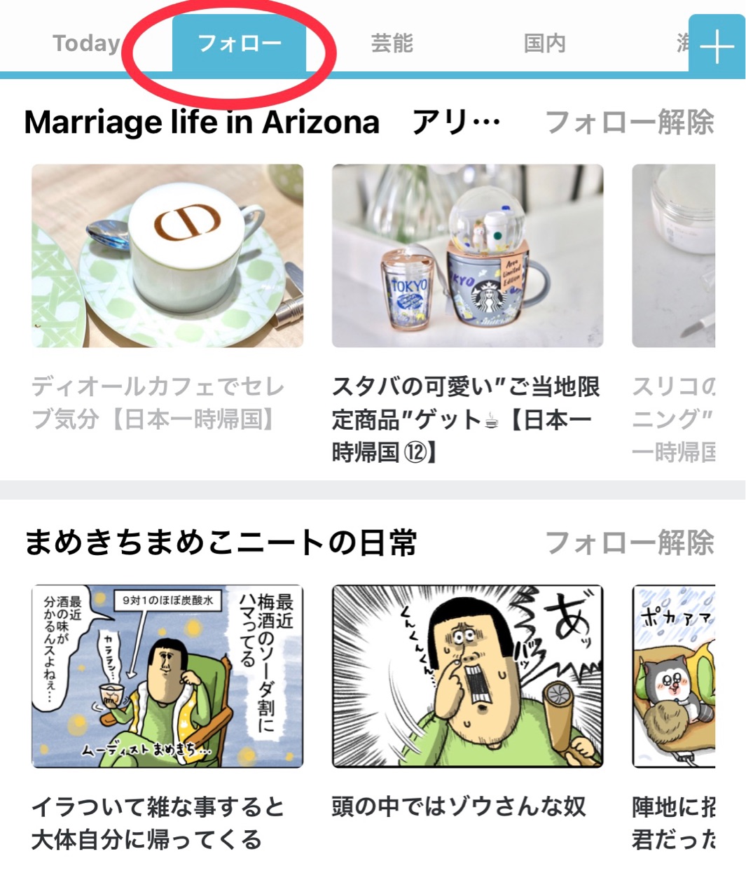 メインページからは、ニュースが見られる”Today“の隣の”フォロー“をタップすると、皆さまが登録したブログが新着順に出てきます↓