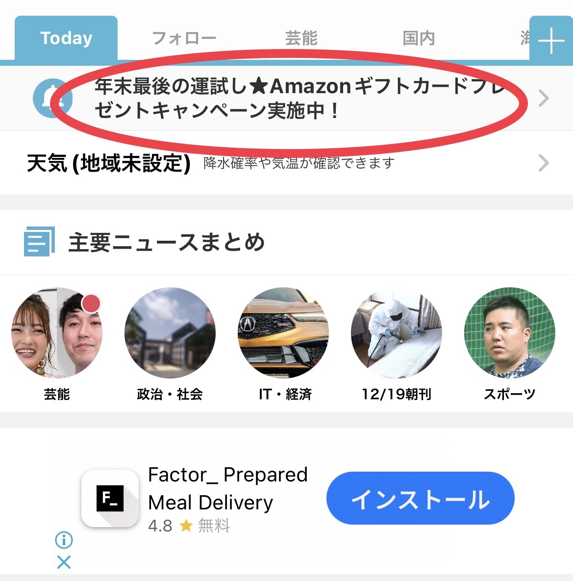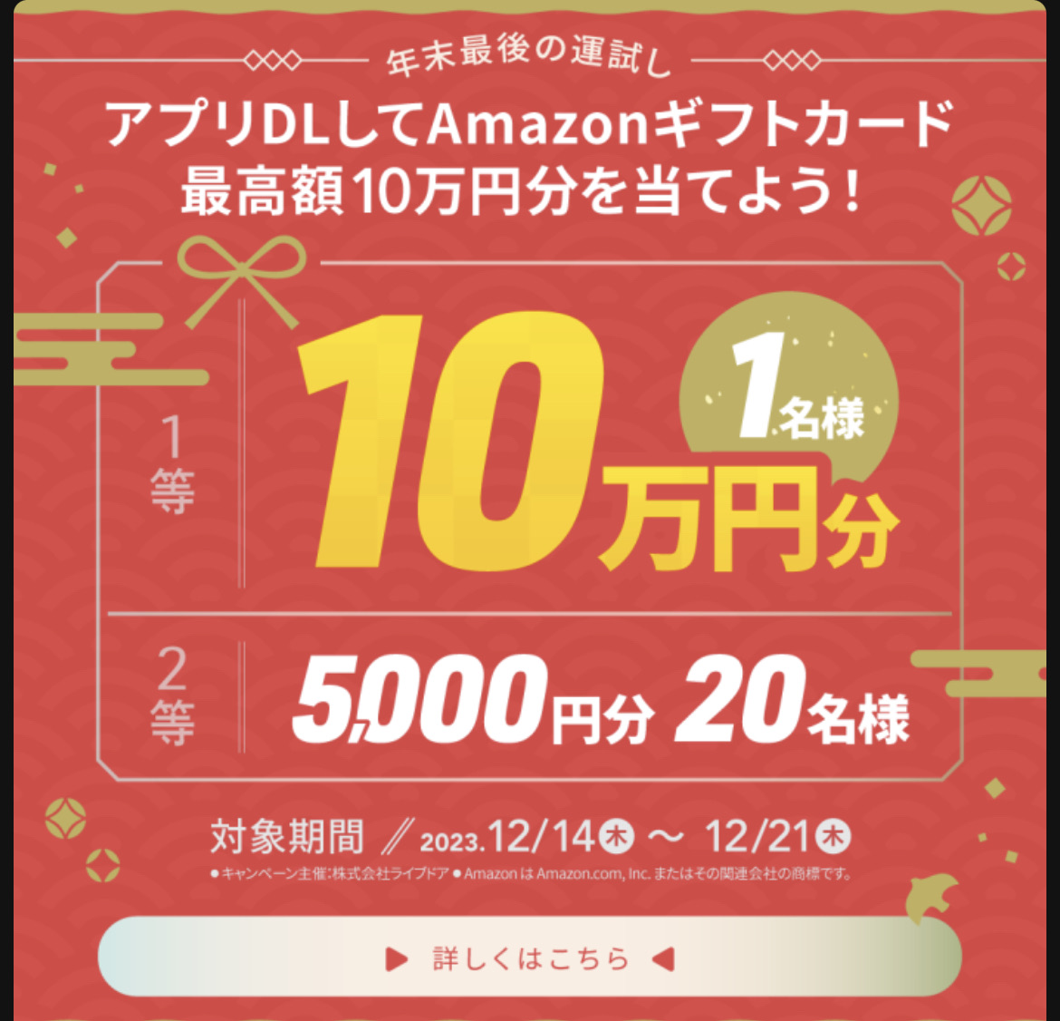 12/21までにライブドアアプリをダウンロードしてくださった方は、アマゾンギフトカードが当たるそうなので、年末の運試しにチャレンジしてみてください🎯