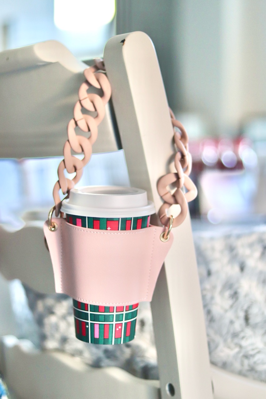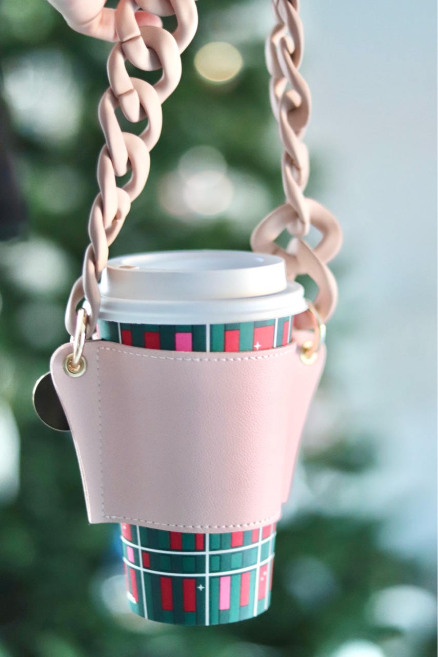 合皮のカップスリーブとチェーンが付いた、リユーザブルカップ スリーブ($23)☕︎