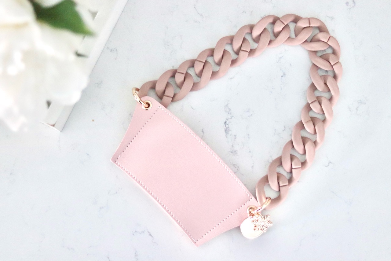 チェーンも私が購入したピンクグレーッシュなマットな肌ざわりなもあったり、ゴールド、べっ甲があったり...