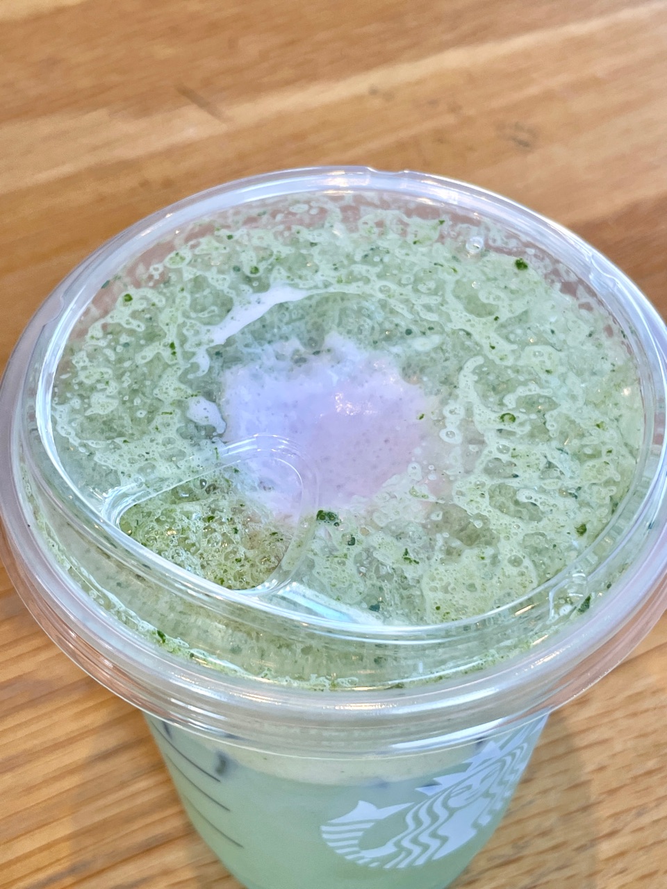 今回のIced Lavender Cream Oatmilk Matchaは、コールドフォームの量はある程度見えましたが、やっぱり抹茶の泡がトップにあります。