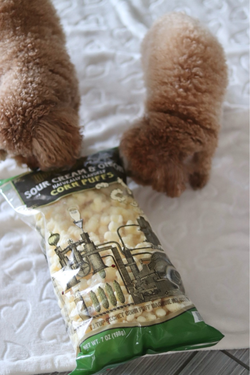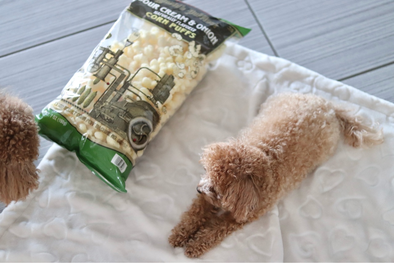 我が家のアイドル、トイプードルのシェリーメイ(1500g)が、足を伸ばしてもまだスナック菓子のほうが大きいw↓