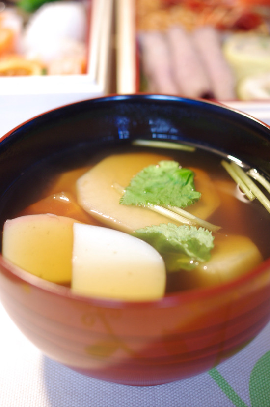 我が家のお雑煮は、色薄めのスープで、里芋、人参、大根、かまぼこが入ってます。