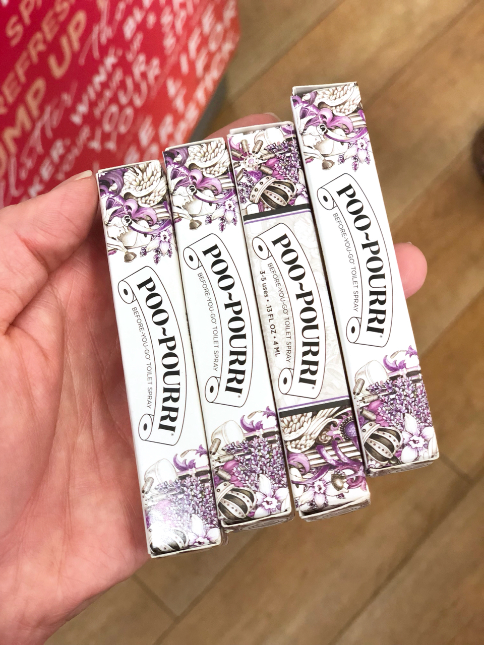 通常のPoo~Pourriは、家のトイレで使用してますが(以前Poo~pourriの事を書いたブログは、こちらから★)、携帯用は手のひらサイズなので、通常のものと比べて場所も取らないし、飛行機のトイレに持っていくのに小さくて便利です。(手の中に隠して持っていける❣️)