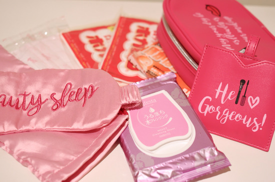 そのポーチの中には、アイマスク(こちらも、ULTAで乳がん研究寄付で販売していたもの)、メイク落とし、ホッカイロ3つ、マスクが入ってます。