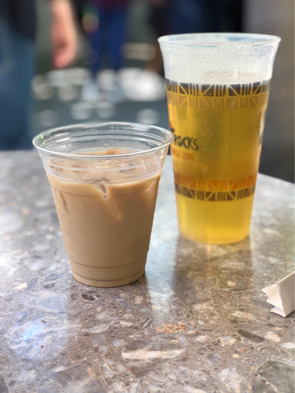 ジャスティンはビール(また!!)、私はアイスカフェラテ。