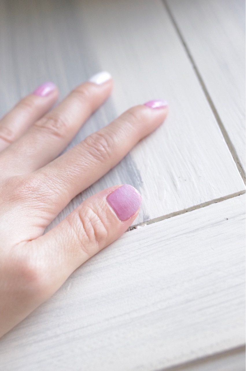硬化後、フレンチネイルになる部分(私はライトパープルをチョイス)を、フレンチネイルの様に塗ります↓